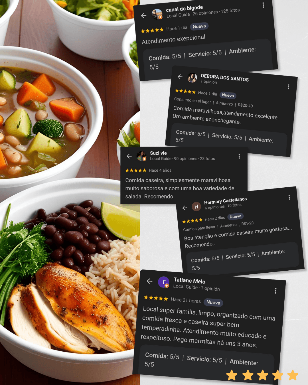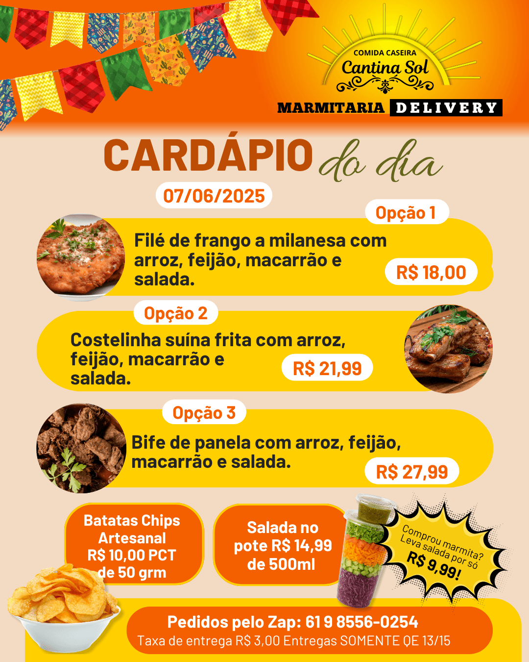 - Marmitas caseiras: Pratos caseiros preparados com ingredientes frescos e de qualidade. Todo dia um cardápio diferente!