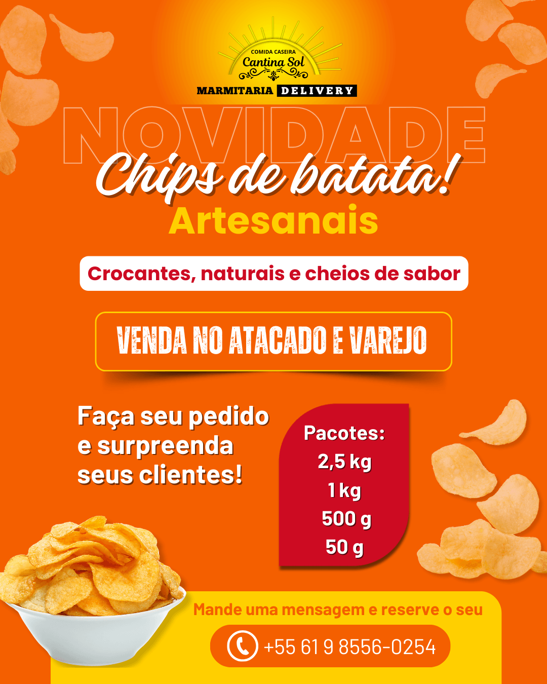 - Batatas chips artesanal: Oferecemos batata chips no atacado para restaurantes, bares e outros.